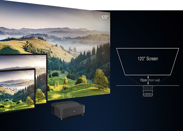 Redefining your home theatre set-up, the EpiqVision Ultra EH-LS300B, with its ultra-short throw capability of 26.6cm, projects up to a spectacular 120-inch screen size of crisp and bright images. Fitting right into your space’s aesthetic, the compact laser projection TV offers the flexibility to place it anywhere that is convenient for you.