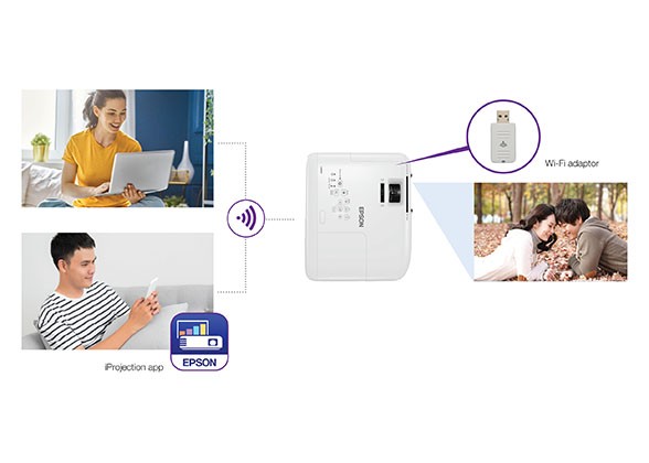 Projecting high contrast, vivid images smoothly is made convenient with the wireless transmission feature in our projectors. With the built-in Wi-Fi adaptor, Miracast connectivity and iProjection app, you can now project images directly from Android and Apple iOS smart devices, PCs and even laptops.